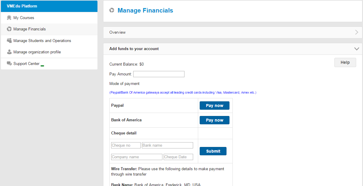 Under the “Manage Financials” section in your partner portal, you have an option to add funds to your account. You can use the Paypal and Bank of America payment gateways to make payments using a credit card. We accept all leading credit cards including Visa, Mastercard and Amex. You can also send a check or wire transfer to our account.