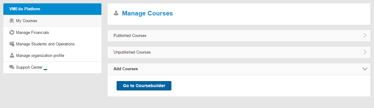 You will get free access to the V.A.C.P. portal after you submit an online application. This will provide you access to the VMEdu Learning Management System (LMS), where you can easily create your online courses through an easy-to-use cloud based “VMEdu Course Builder.” This interface enables the uploading of videos; test questions; flashcards and glossary; study guides and more. To access the course builder, login to your partner portal using the credentials provided in the registration email and go to the “My Courses” section. You can check out our detailed User Guide, which provides step-by-step instructions to create high quality courses using the Course Builder.